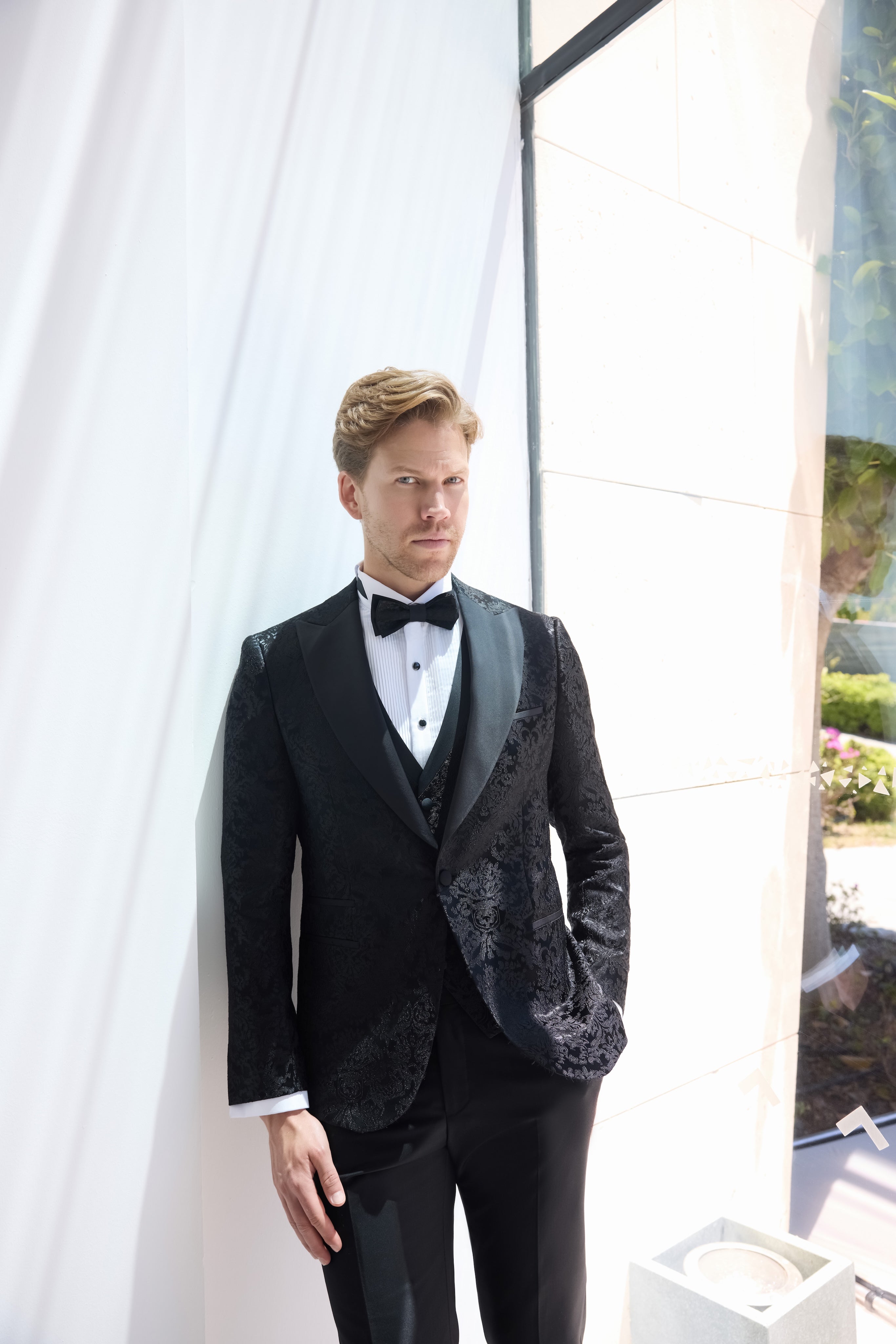 Command attention with this elegant tuxedo, crafted for timeless style and confident presence. The blazer features a sharp peak satin lapel that adds structure and height to the silhouette, paired with a luxurious black jacquard fabric that offers subtle depth through its textured floral pattern.