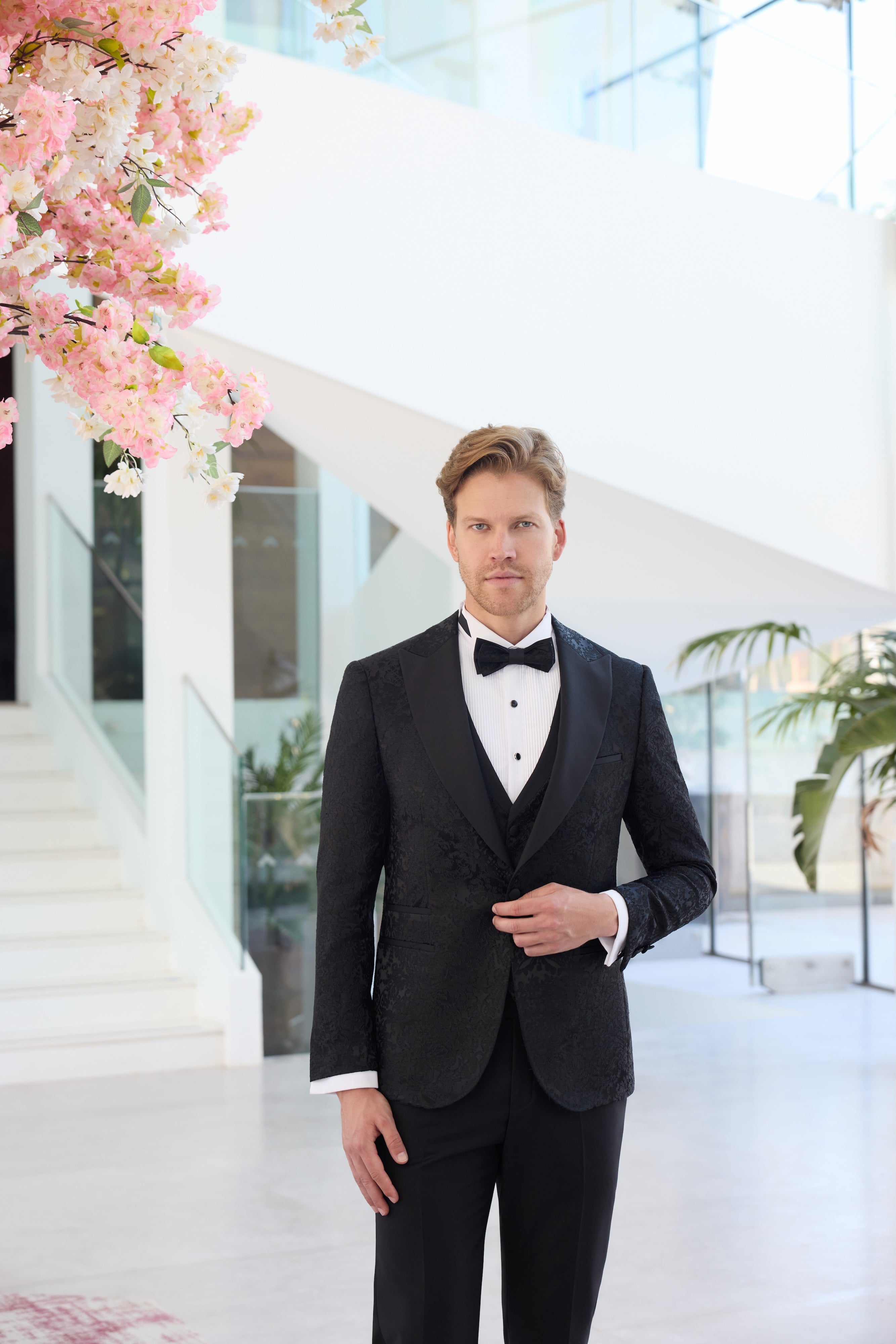 Elevate your formalwear with this refined 4 piece suit set, which includes a blazer, waistcoat, trousers, and a crisp white shirt.
