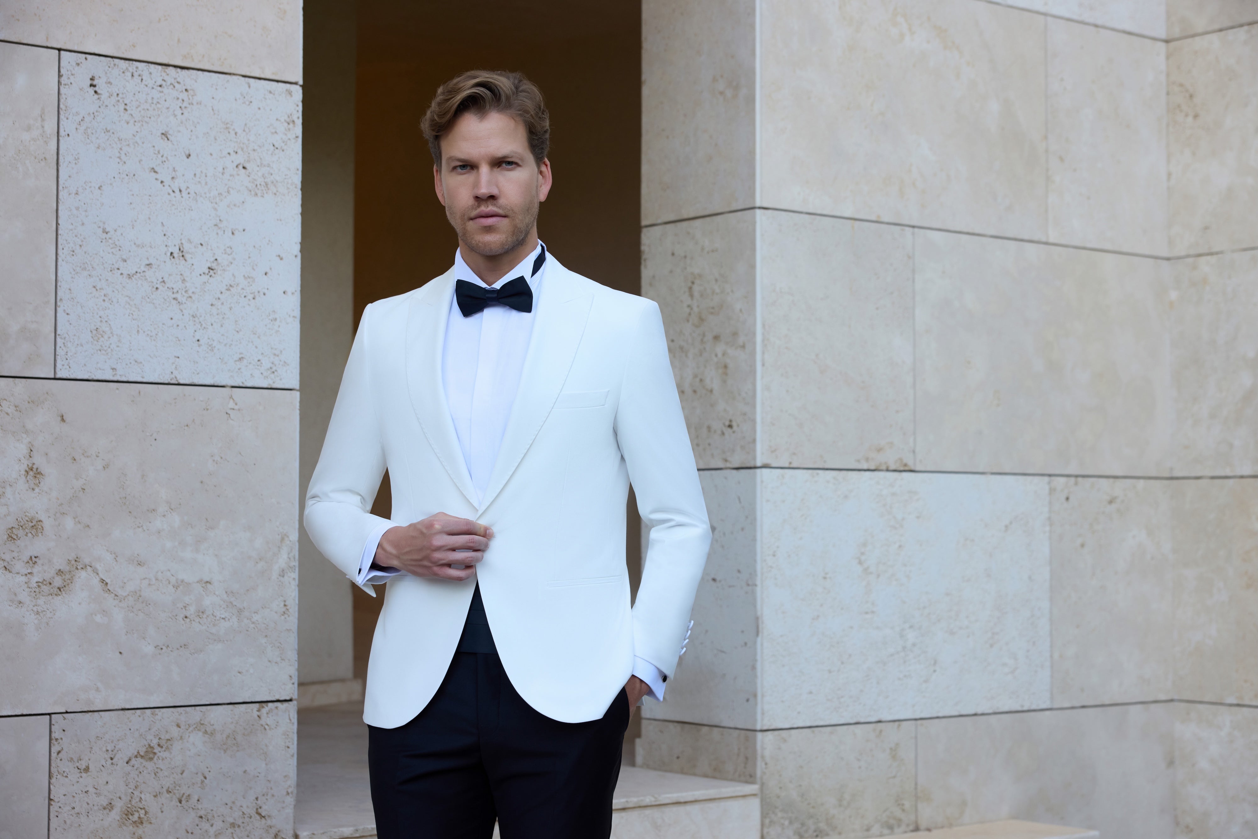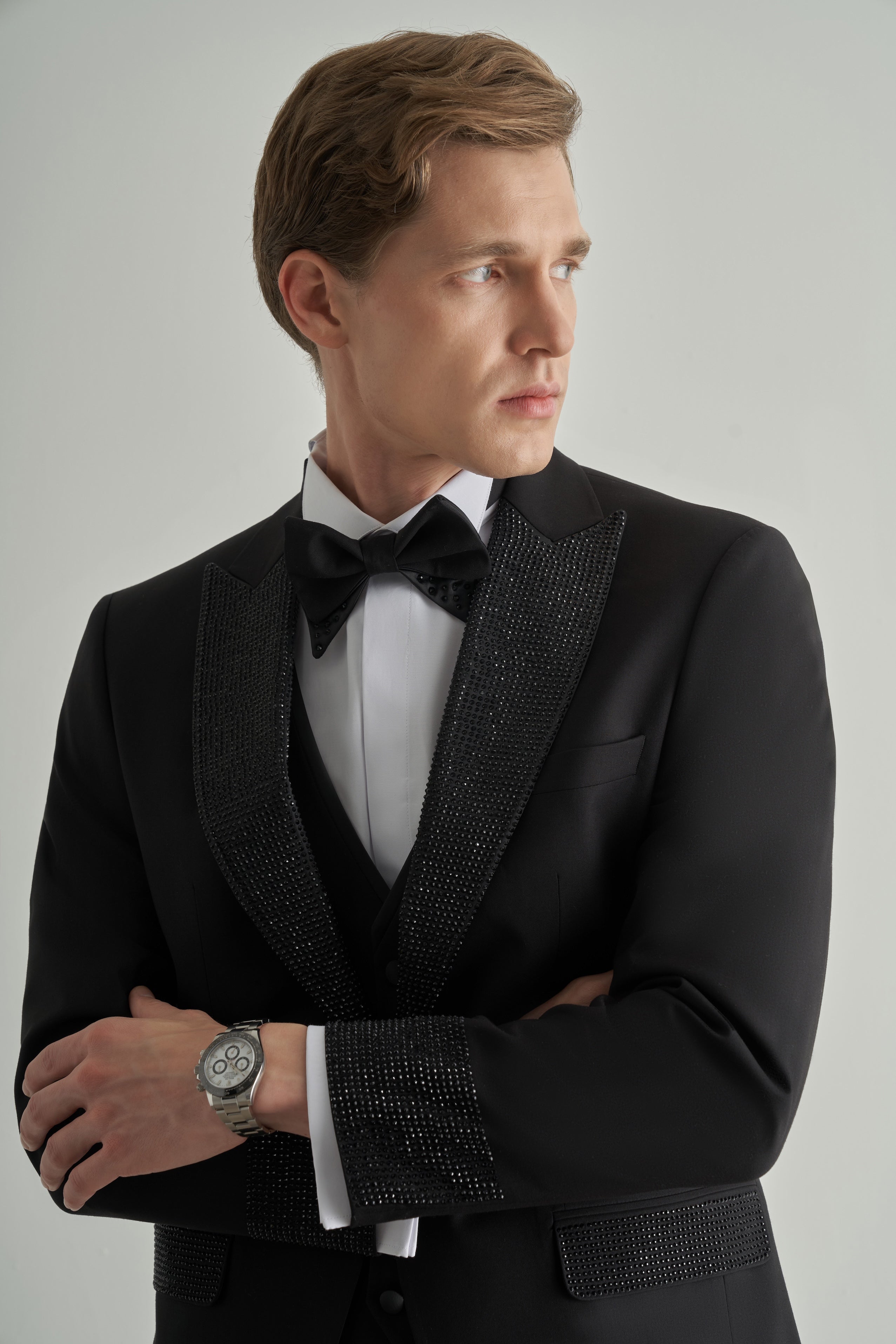 Designed for the modern gentleman with a taste for timeless elegance, this tuxedo blends classic formality with refined detailing. The jacket features a sharp satin peak lapel that commands attention without being overstated.